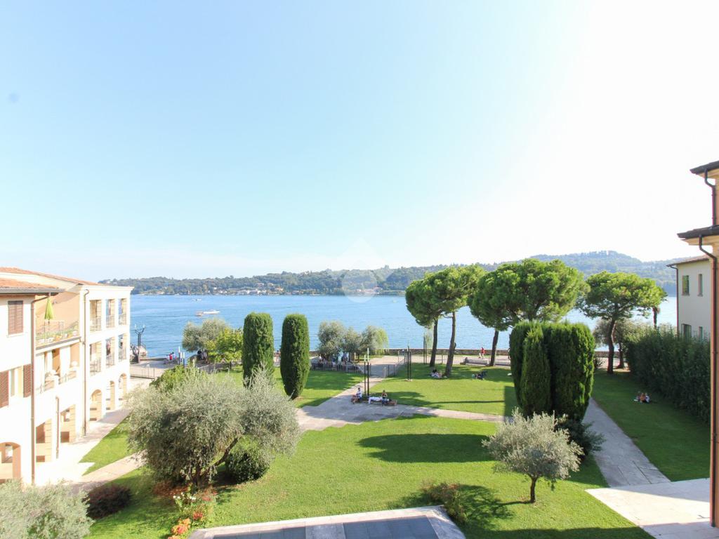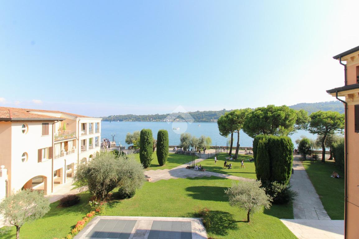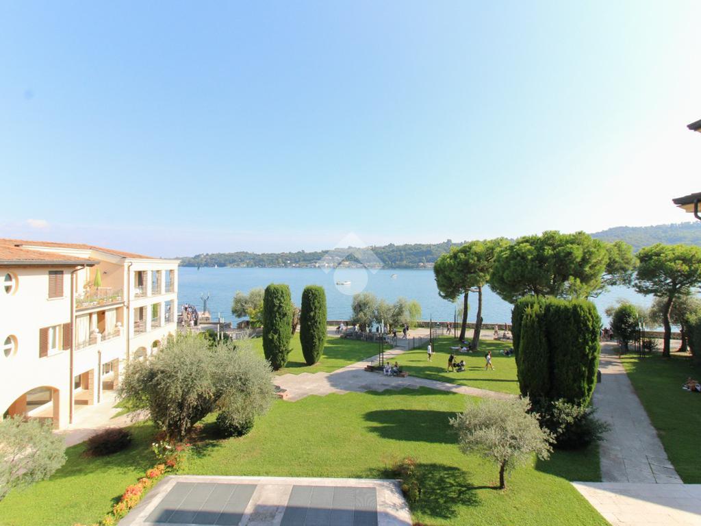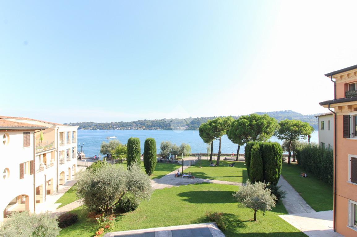 L'ingresso dell'appartamento apre su un ampio soggiorno, luminoso e accogliente, grazie alla presenza di due grandi porte-finestre che affacciano sul terrazzo. Da qui si gode una vista aperta sul lago e sul lungolago di Salò, uno scorcio ampio e suggestivo, particolarmente apprezzato per la sua esposizione e profondità visiva. La cucina è separata, semi-abitabile, e completano il piano un antibagno e un comodo bagno di servizio. L'intera abitazione è pavimentata in parquet di pregio, che dona continuità e calore a tutti gli ambienti.