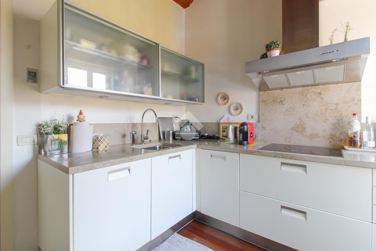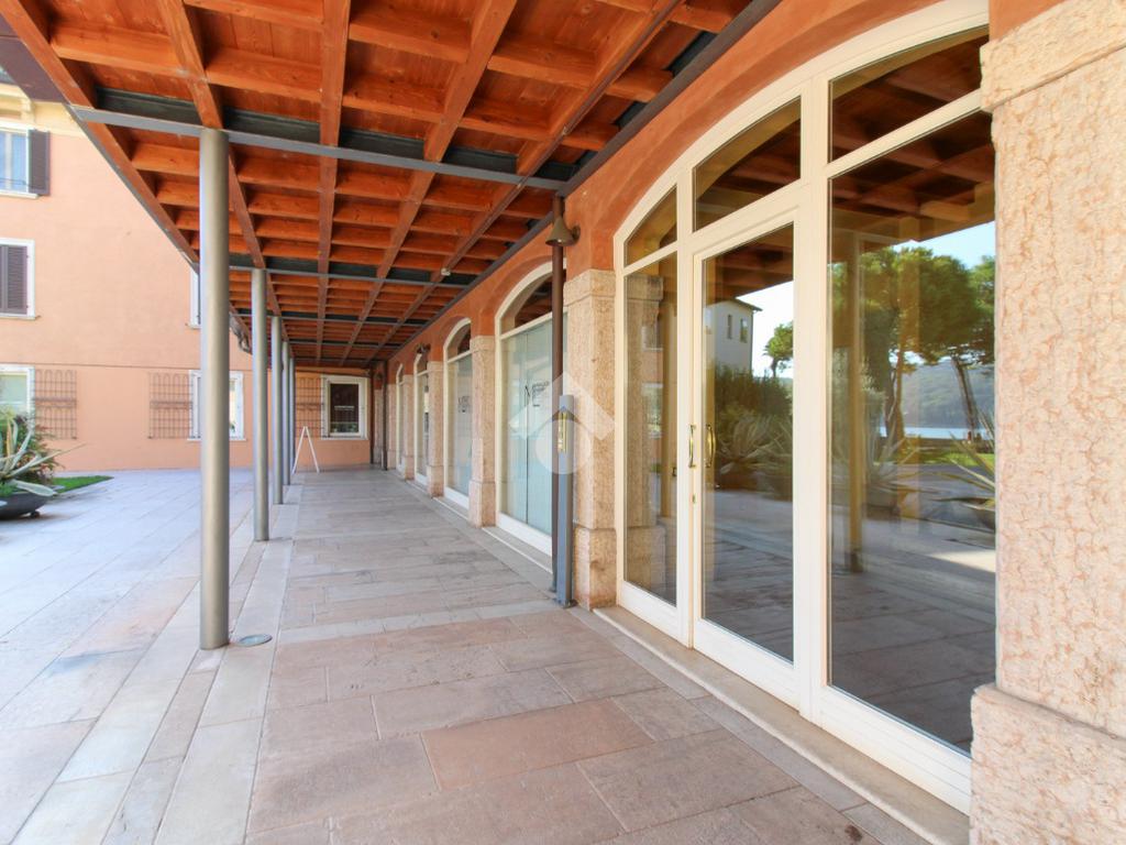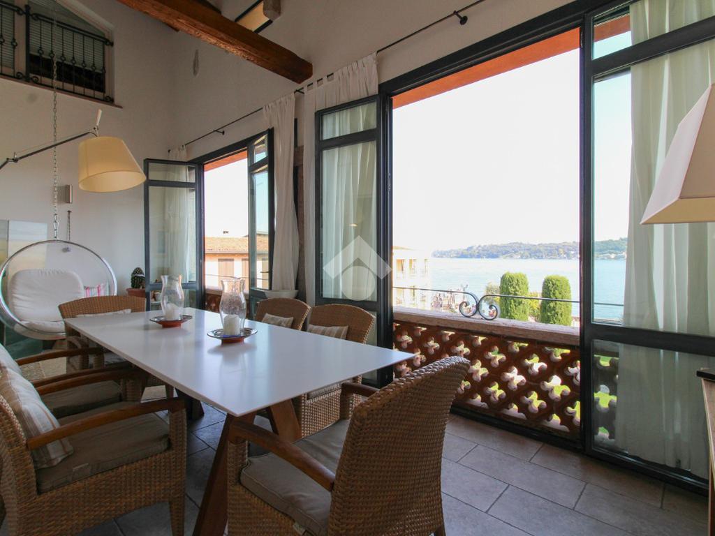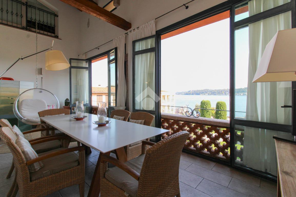 L'ingresso dell'appartamento apre su un ampio soggiorno, luminoso e accogliente, grazie alla presenza di due grandi porte-finestre che affacciano sul terrazzo. Da qui si gode una vista aperta sul lago e sul lungolago di Salò, uno scorcio ampio e suggestivo, particolarmente apprezzato per la sua esposizione e profondità visiva. La cucina è separata, semi-abitabile, e completano il piano un antibagno e un comodo bagno di servizio. L'intera abitazione è pavimentata in parquet di pregio, che dona continuità e calore a tutti gli ambienti.