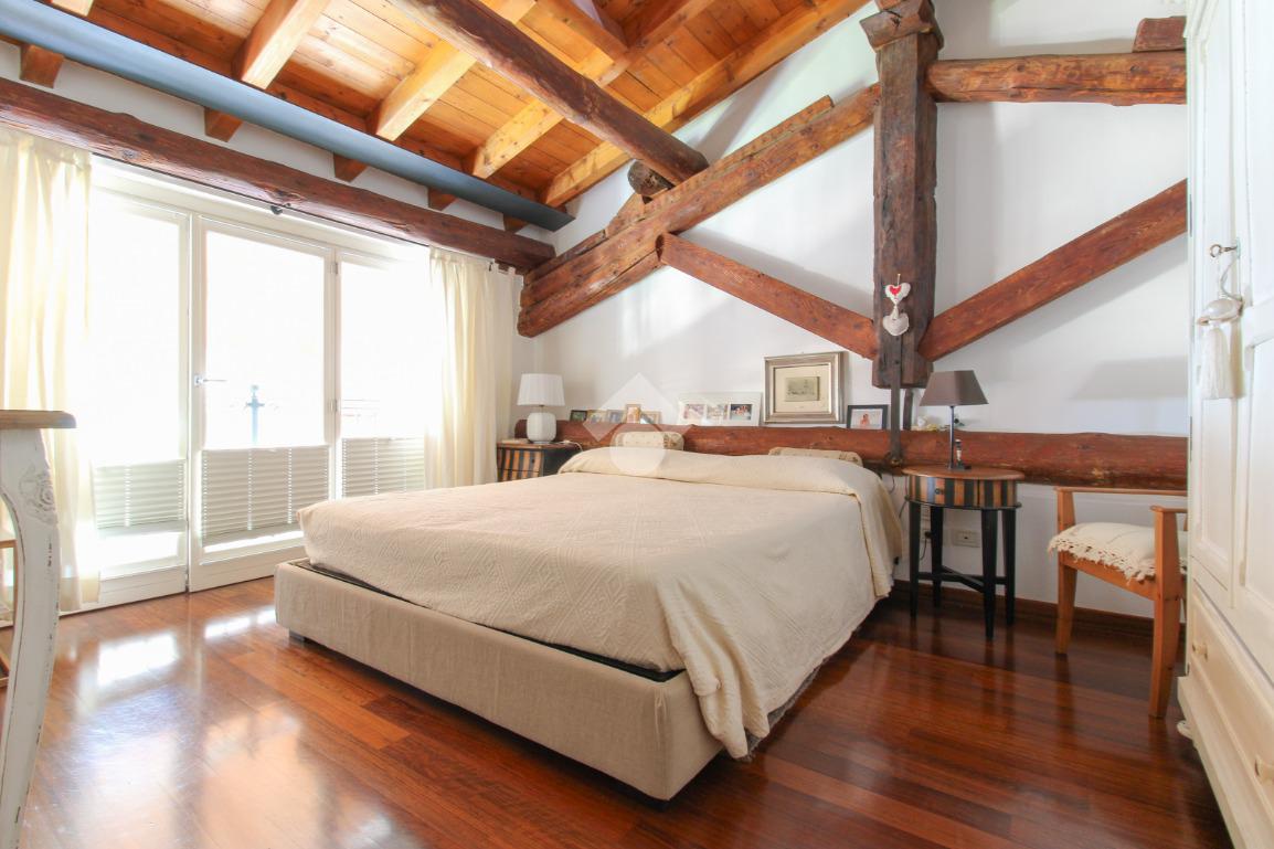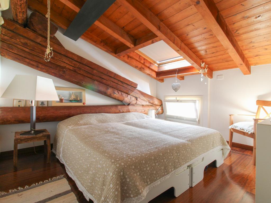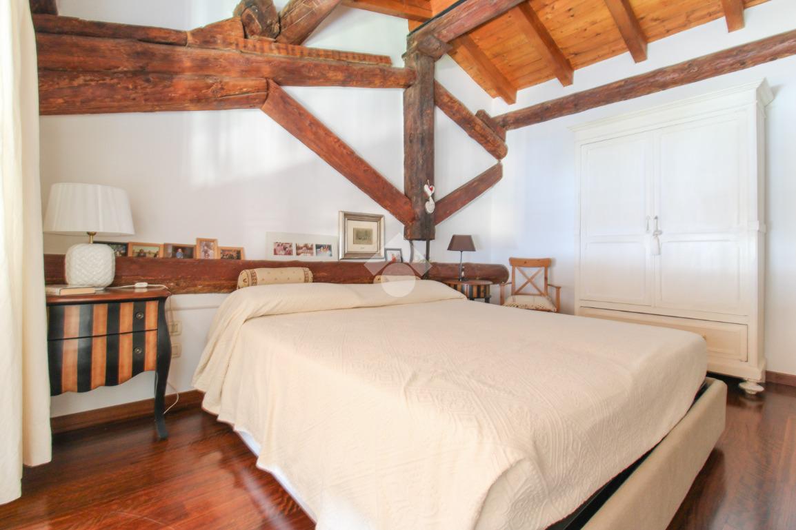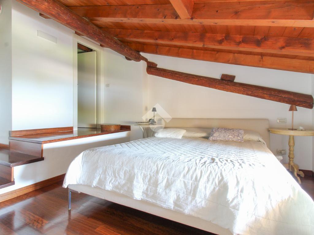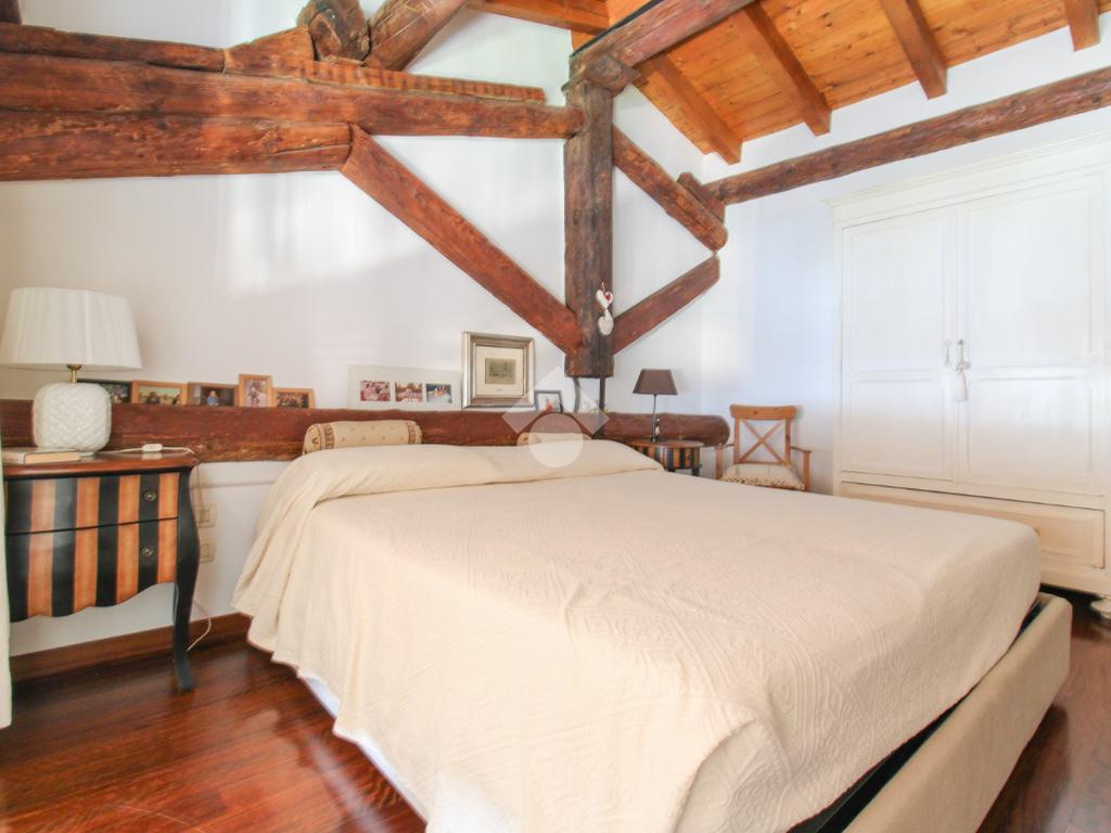 Una scala interna in ferro rivestita in legno conduce al piano superiore, dedicato alla zona notte. Qui le travi in legno a vista, mantenute e valorizzate durante la ristrutturazione, conferiscono un carattere autentico e raffinato. Le tre camere da letto sono tutte di ampia metratura. La camera padronale è dotata di bagno en suite, cieco ma areato tramite ventola di aspirazione, e curato nei dettagli e nelle finiture. Dalla stanza, alcune finestre rettangolari in alto offrono scorci suggestivi sul lago. Le altre due camere, anch'esse spaziose, condividono un secondo bagno finestrato, con box doccia in vetro e sanitari sospesi.