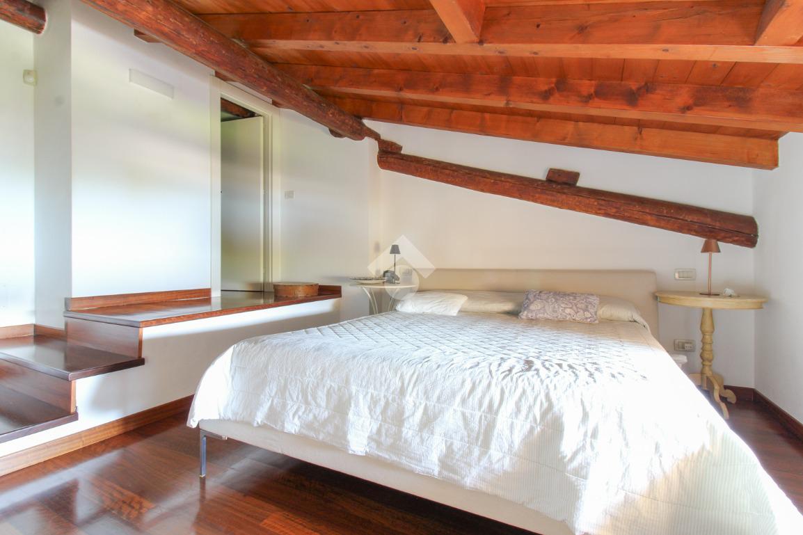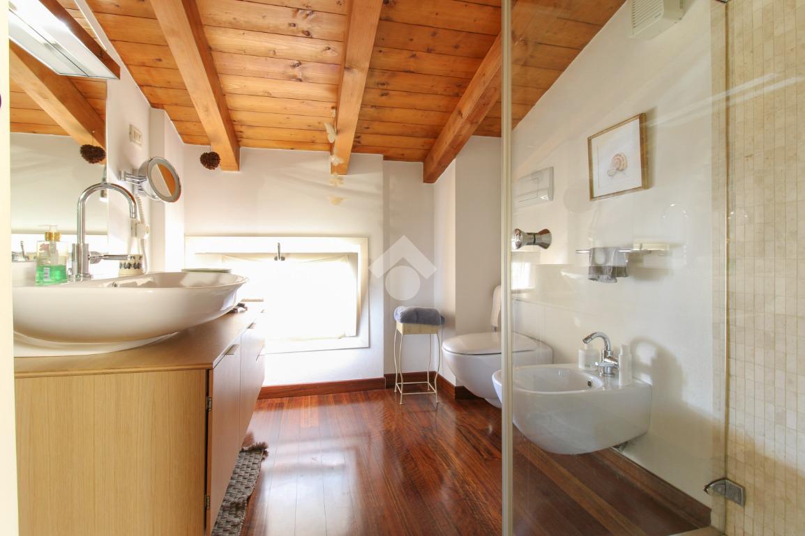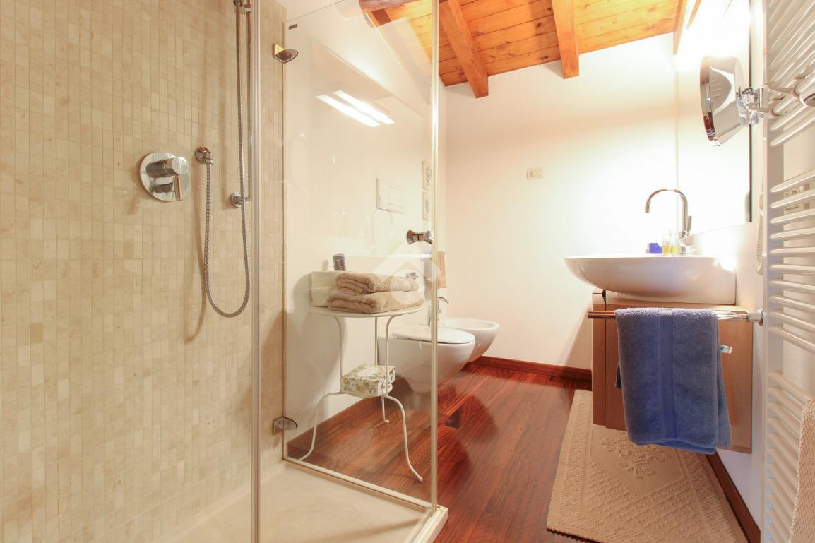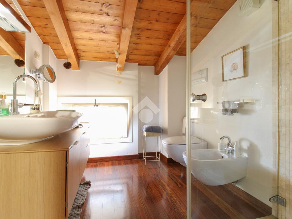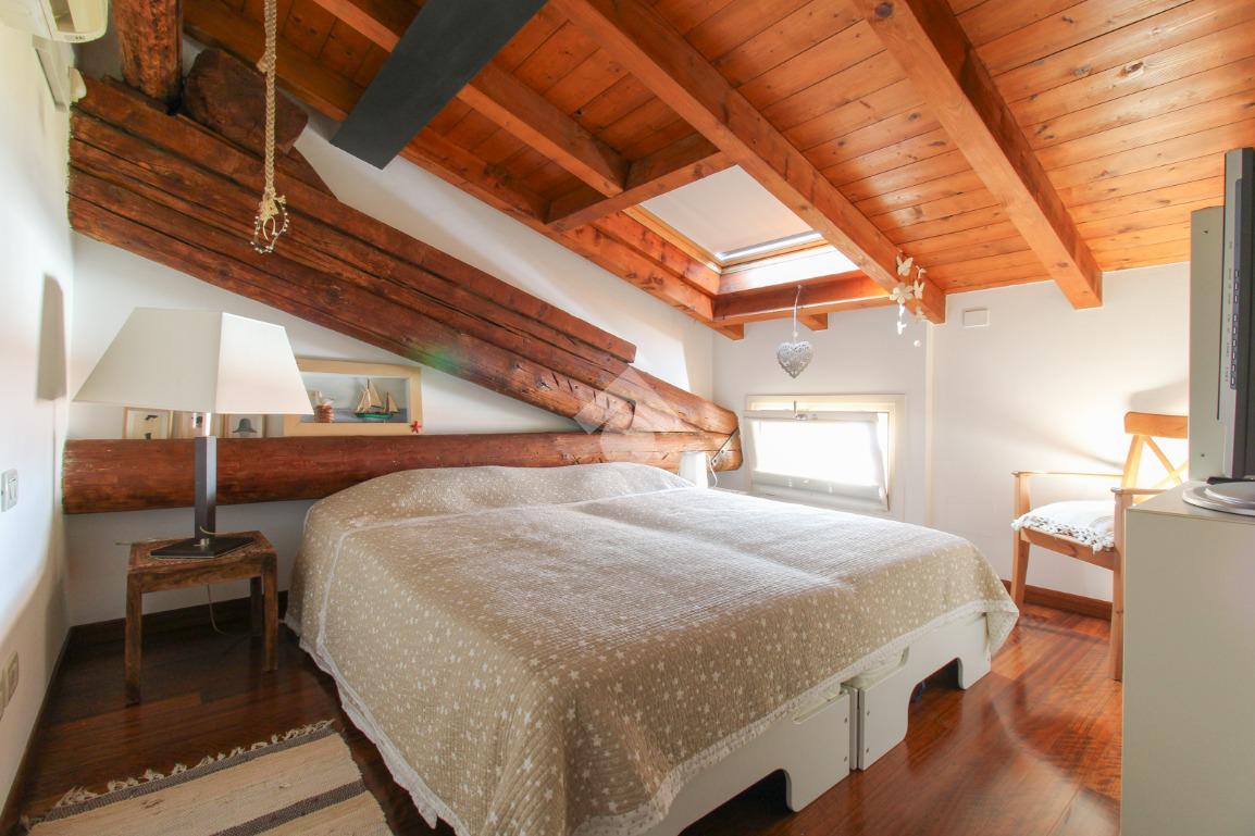 Una scala interna in ferro rivestita in legno conduce al piano superiore, dedicato alla zona notte. Qui le travi in legno a vista, mantenute e valorizzate durante la ristrutturazione, conferiscono un carattere autentico e raffinato. Le tre camere da letto sono tutte di ampia metratura. La camera padronale è dotata di bagno en suite, cieco ma areato tramite ventola di aspirazione, e curato nei dettagli e nelle finiture. Dalla stanza, alcune finestre rettangolari in alto offrono scorci suggestivi sul lago. Le altre due camere, anch'esse spaziose, condividono un secondo bagno finestrato, con box doccia in vetro e sanitari sospesi.