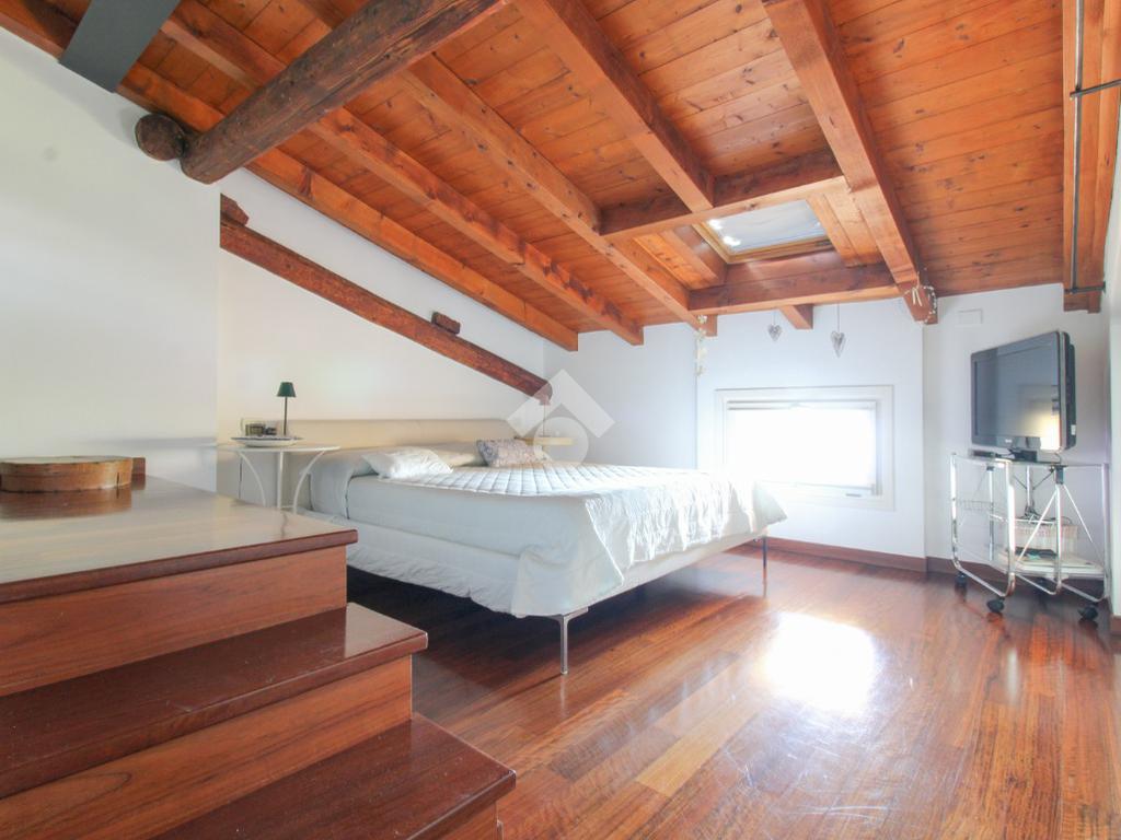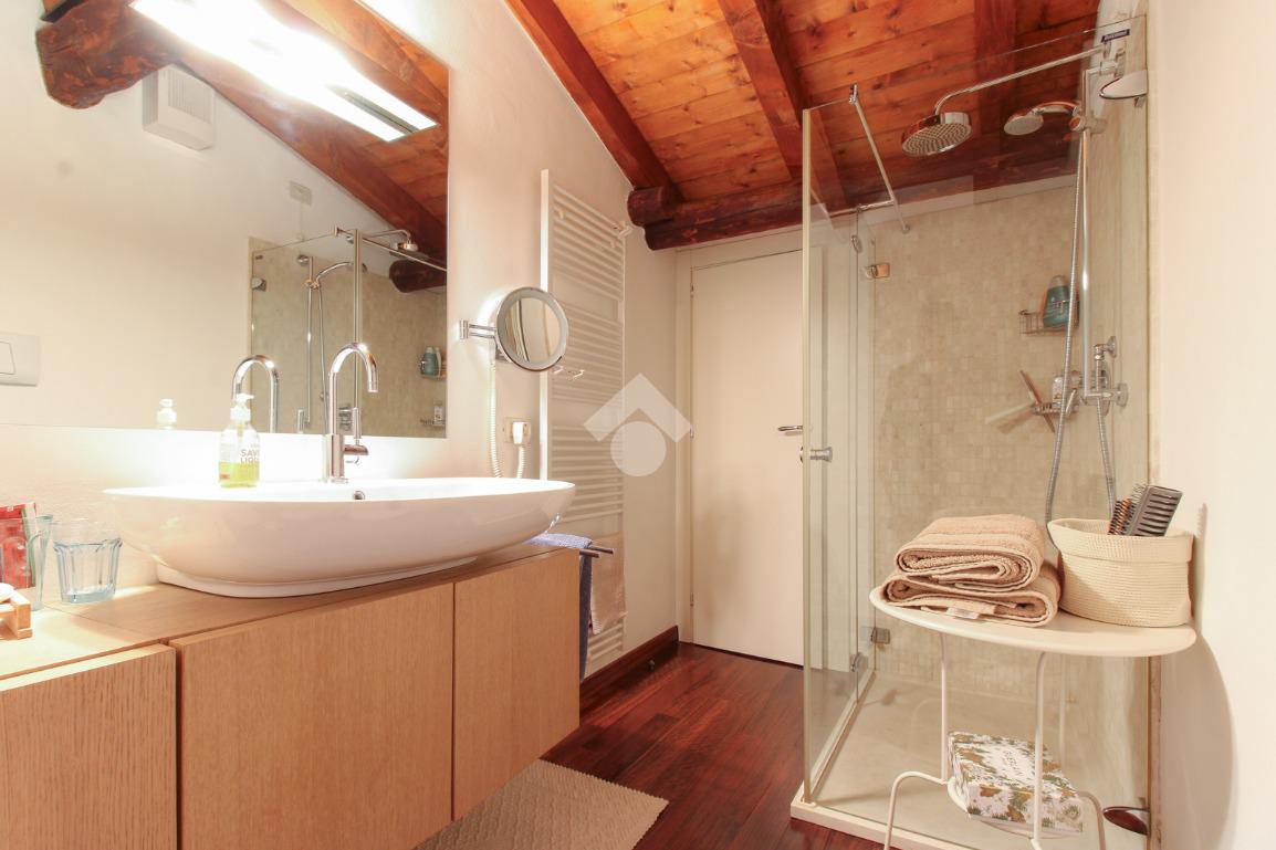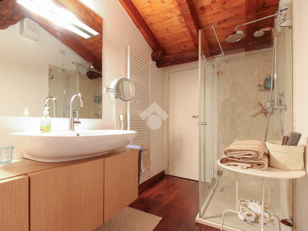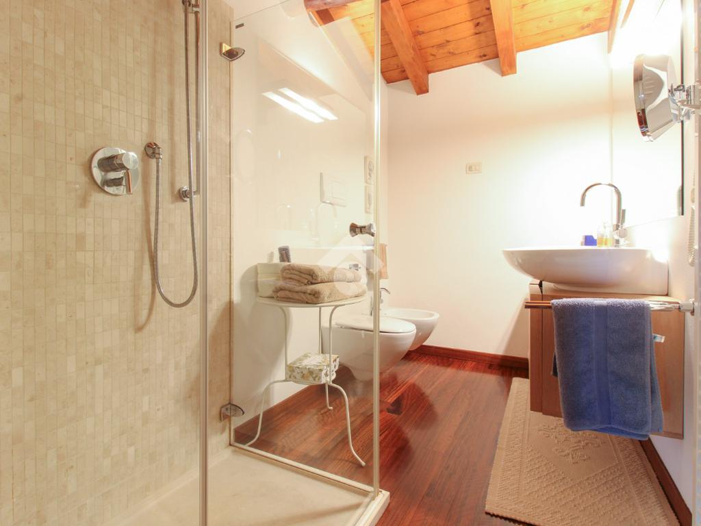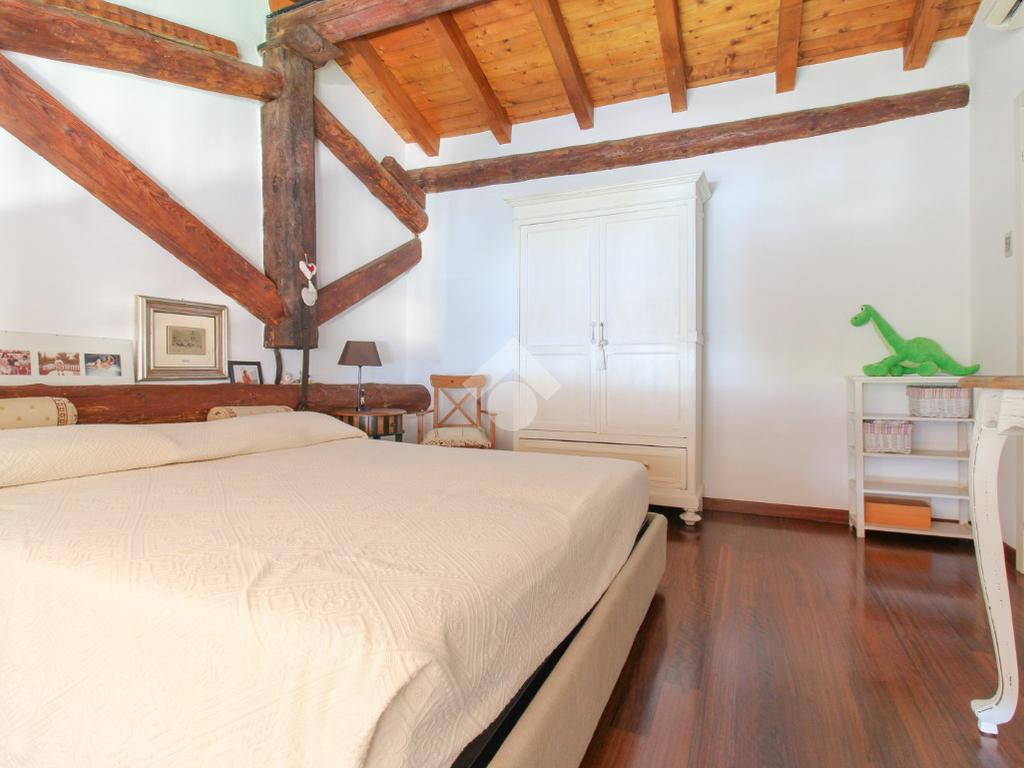Una scala interna in ferro rivestita in legno conduce al piano superiore, dedicato alla zona notte. Qui le travi in legno a vista, mantenute e valorizzate durante la ristrutturazione, conferiscono un carattere autentico e raffinato. Le tre camere da letto sono tutte di ampia metratura. La camera padronale è dotata di bagno en suite, cieco ma areato tramite ventola di aspirazione, e curato nei dettagli e nelle finiture. Dalla stanza, alcune finestre rettangolari in alto offrono scorci suggestivi sul lago. Le altre due camere, anch'esse spaziose, condividono un secondo bagno finestrato, con box doccia in vetro e sanitari sospesi.