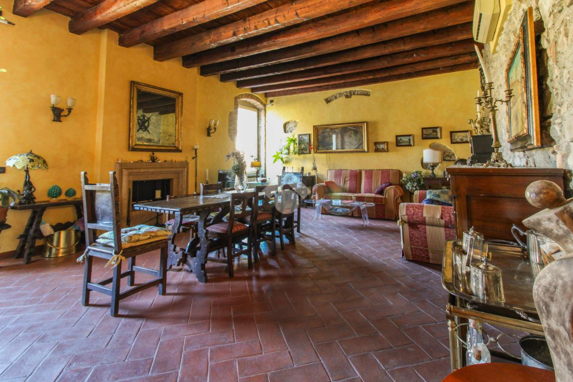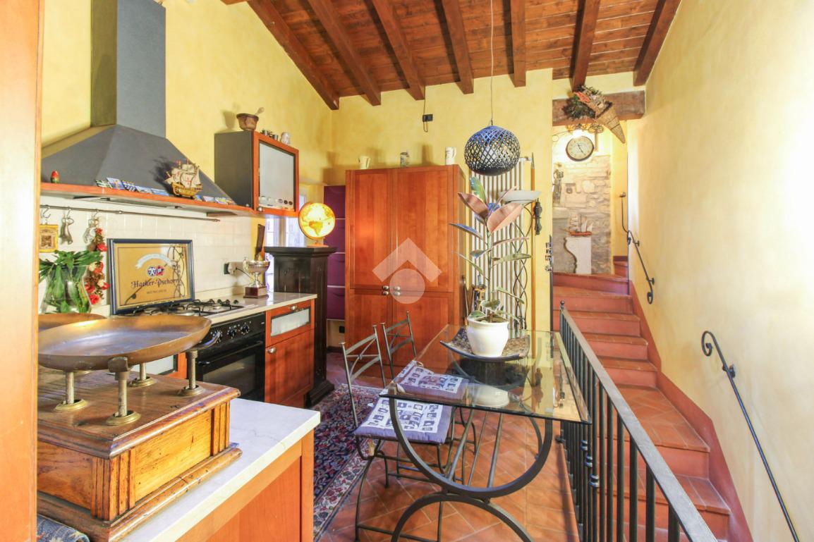 La scala in terracotta d’Impruneta conduce al secondo piano, con una zona living accogliente, caratterizzata dalla parete in pietra a vista e dal camino funzionante. La cucina, separata dal soggiorno da un muro con due aperture laterali, mantiene privacy e funzionalità, mentre un piccolo bagno di servizio completa il piano.