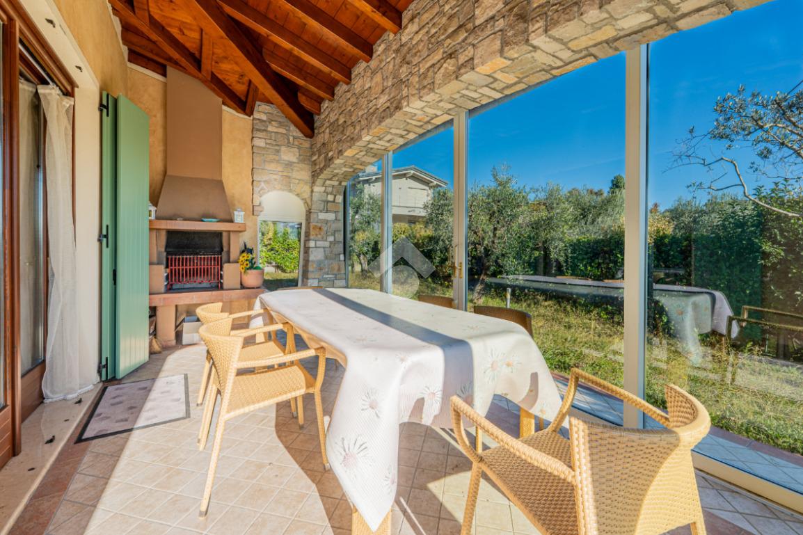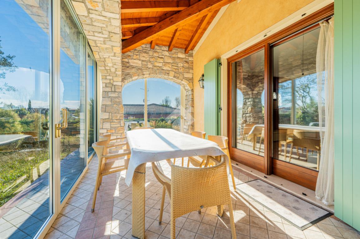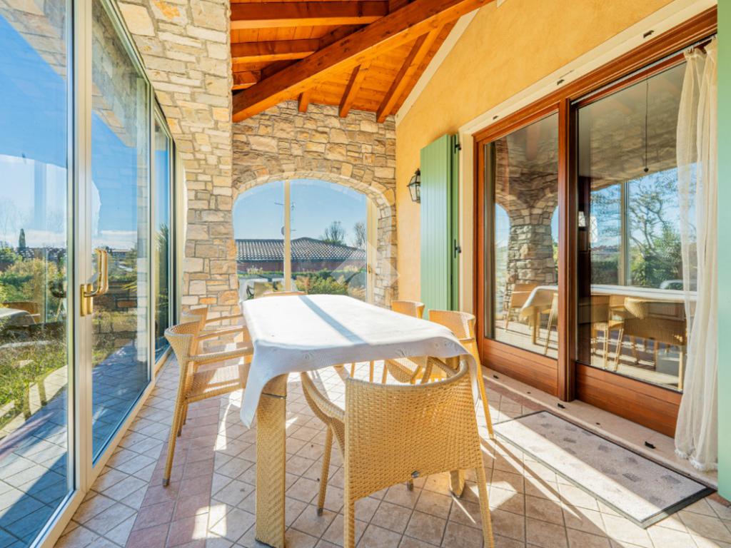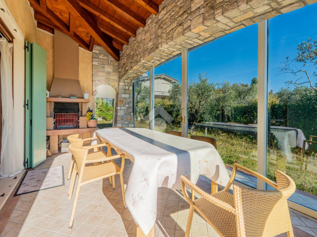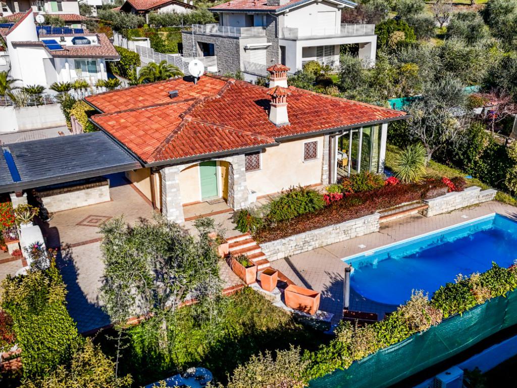 L’esterno della villa è la naturale estensione del suo fascino: un giardino privato avvolge la casa e conduce alla splendida piscina, perfettamente inserita nel contesto e ideale per godere del clima mite del Garda. Il portico e le zone dedicate al relax completano un ambiente esclusivo e accogliente.