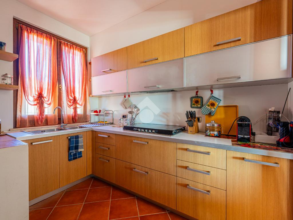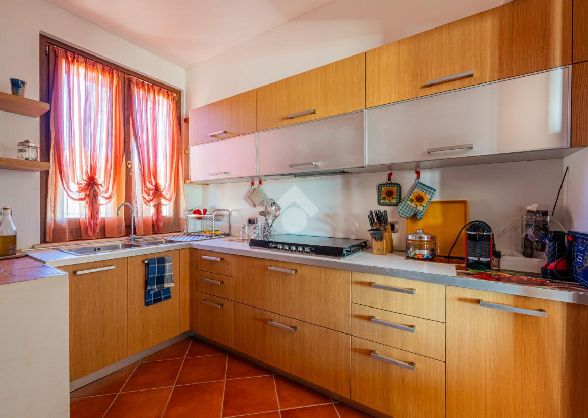 Varcando il portone d’ingresso si viene accolti da un ampio e luminoso soggiorno, un ambiente raffinato e accogliente che rappresenta il cuore pulsante della casa. Le generose vetrate permettono alla luce naturale di avvolgere l’intero spazio e creano una piacevole continuità visiva con il giardino circostante, rendendo il soggiorno ideale per momenti di relax o convivialità. Dal soggiorno si accede anche alla luminosa veranda, uno spazio che estende la zona living verso l’esterno e che può essere vissuto in ogni stagione. Perfetta per colazioni tranquille, letture rilassanti o cene intime, la veranda rappresenta un ambiente privilegiato in cui godere della quiete totale offerta dalla via privata. Adiacente si trova la cucina separata, funzionale e ben organizzata, perfetta per chi desidera mantenere ordine e privacy durante la preparazione dei pasti.